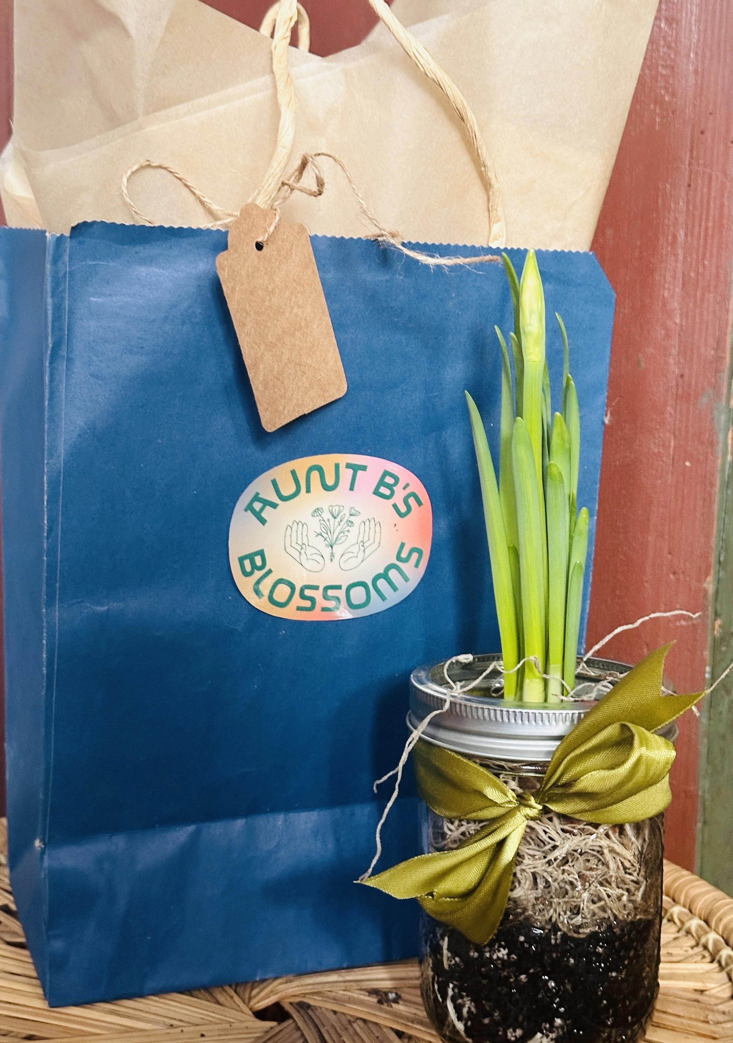 Paper. whites will be gift wrapped with tag and ready to be gifted to your recipient. Easy Peasy !! Porch Pick up next day after order placed online 734 S. Main Street Look for your name and just grab and go. All gifts come with directions on how to care for the paper whites. Let Aunt B do the work for you !!! Merry Christmas